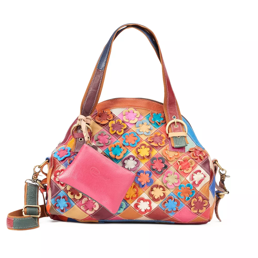 This genuine leather satchel from AmeriLeather features a colorful floral design on one side and a classic striped design on the other.