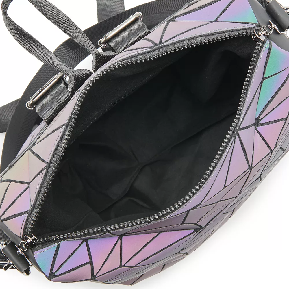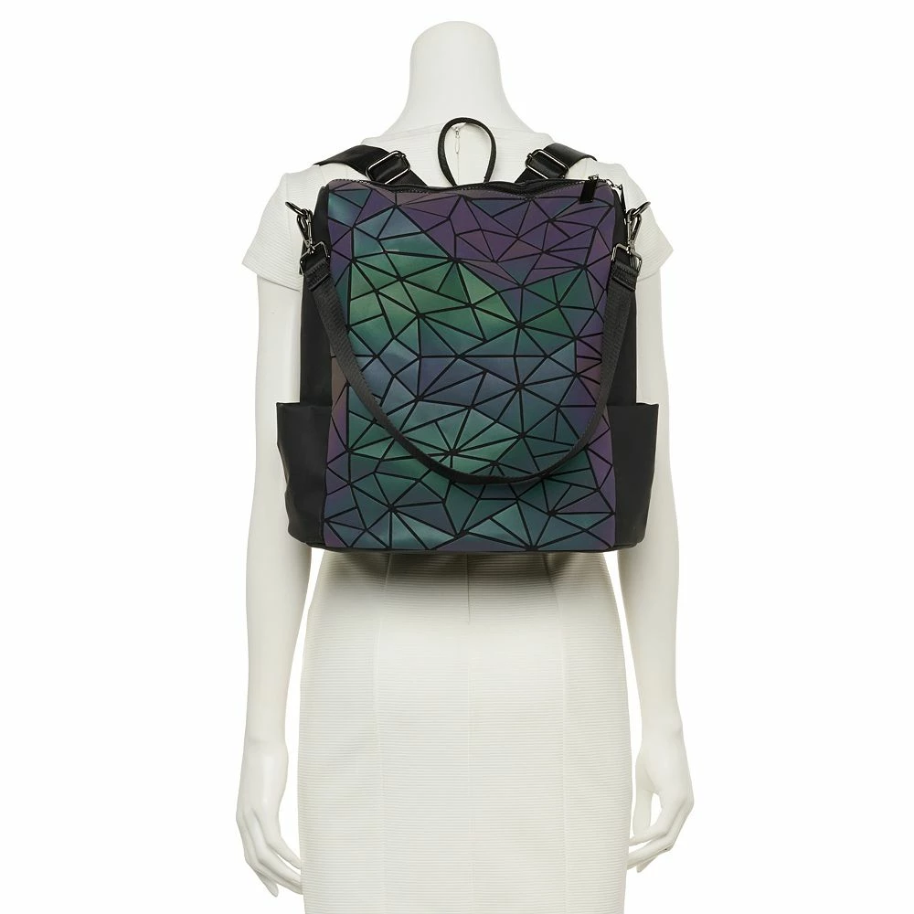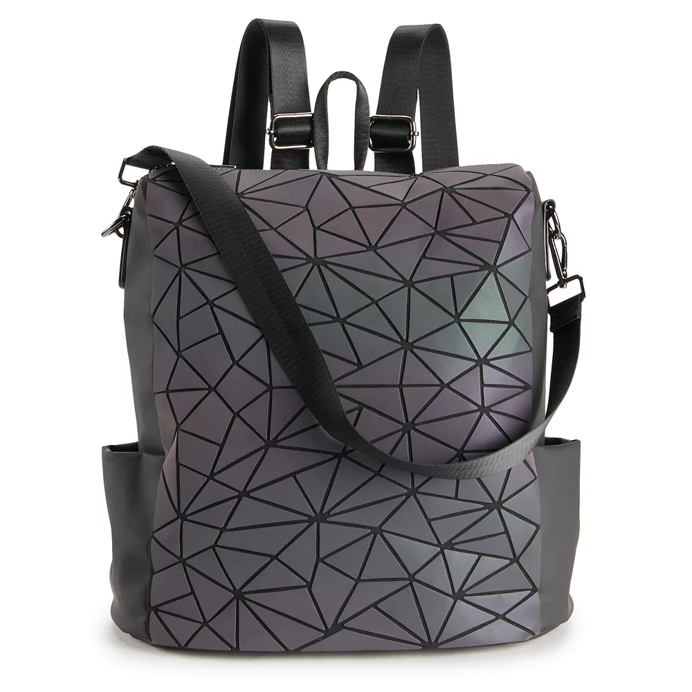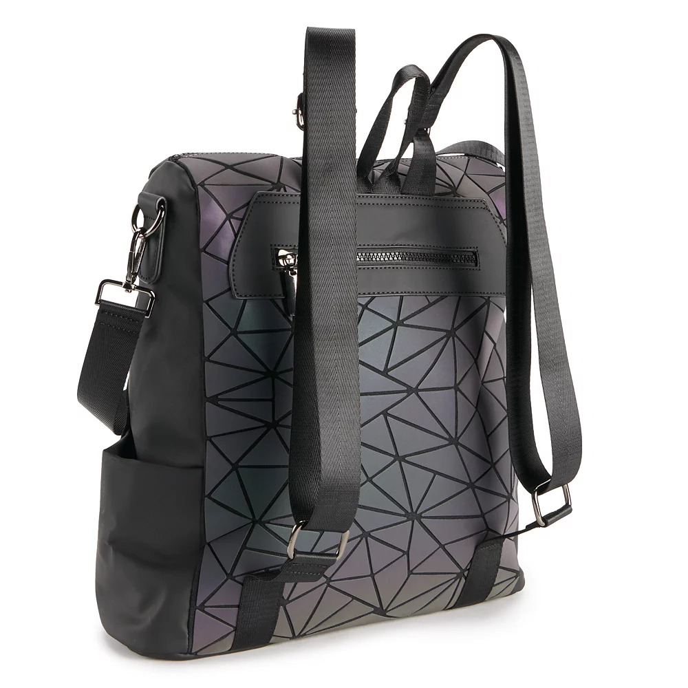 With dual effects, this AmeriLeather Tegan geometric backpack showcases dark hues while in the dark and, if shined on with light, they will transform to illuminating gems that will add to your inner sparkle! Two contrasting styles in one bag make it the perfect companion for any occasion.